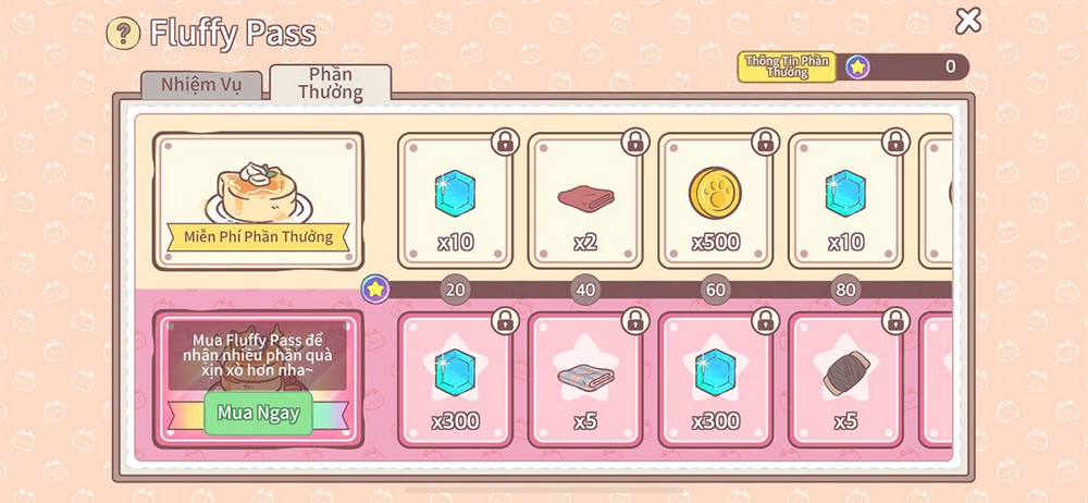 Về cơ chế, Fluffy Pass “Pancake Ngọt Ngào” vẫn giữ lối chơi quen thuộc của các mùa trước. Người chơi chỉ cần hoàn thành nhiệm vụ hằng ngày để tích lũy Điểm Sao, từ đó mở khóa phần thưởng theo từng mốc tiến trình, không áp lực cạnh tranh, đúng với phong cách thư giãn đặc trưng của Cats & Soup: Fluffy Town Việt Nam.